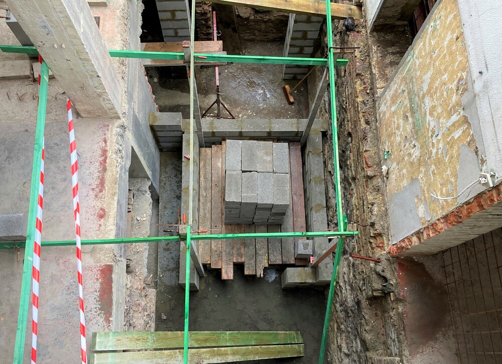 4 mai : En caves, le percement du chevêtre de l’escalier a été réalisé.