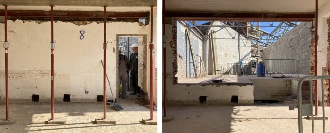 13 avril 2021 : Percement terminé entre la future salle commune et le hall commun.
