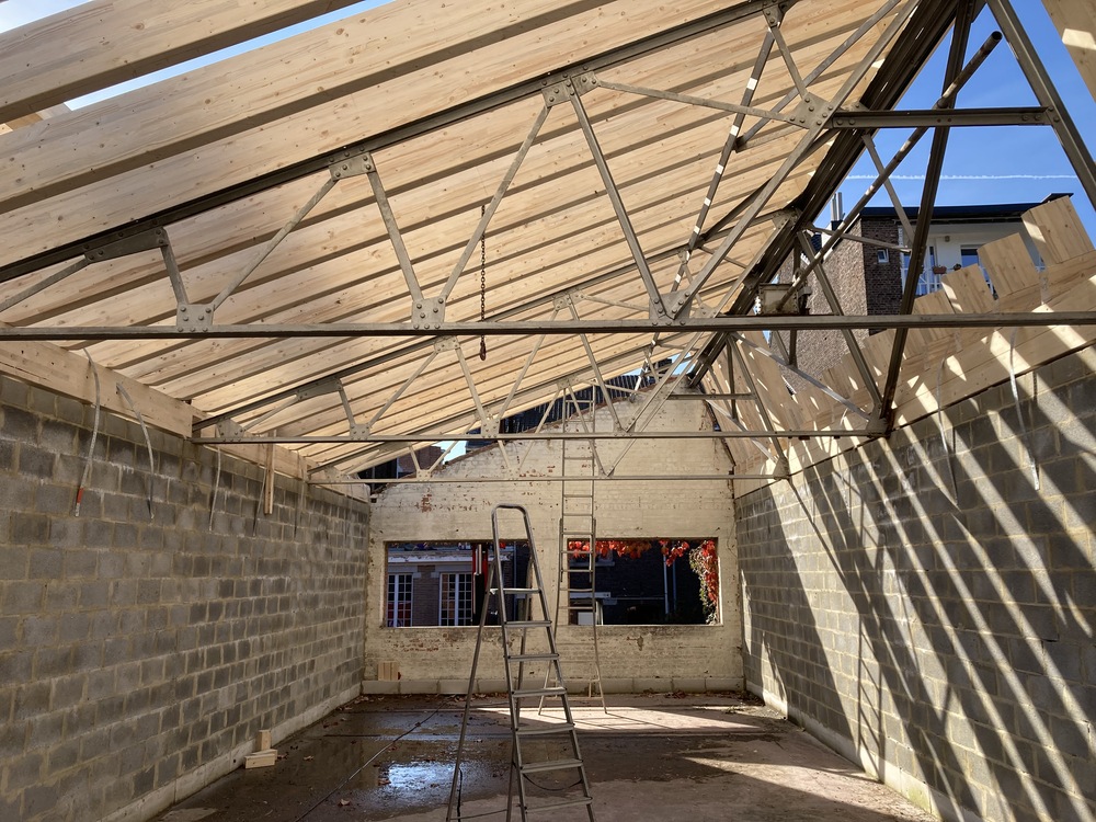 14 décembre : Pose des voligeages sur les toitures des sheds.