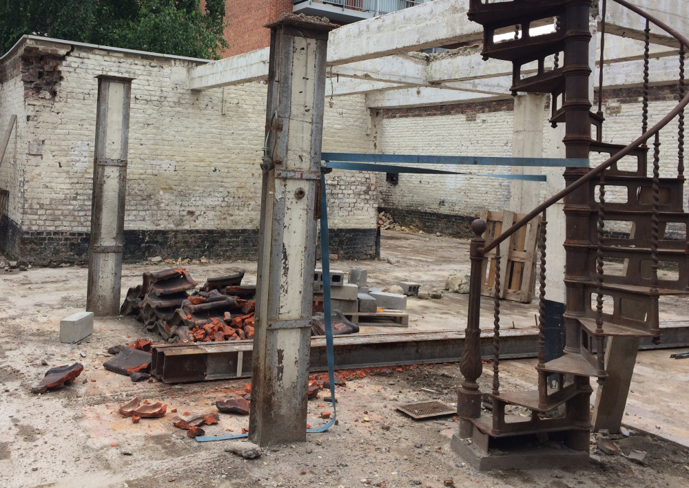 18 mai 2021 : Dans les futurs jardin, l’ancien escalier en fonte fait figure de sculpture.