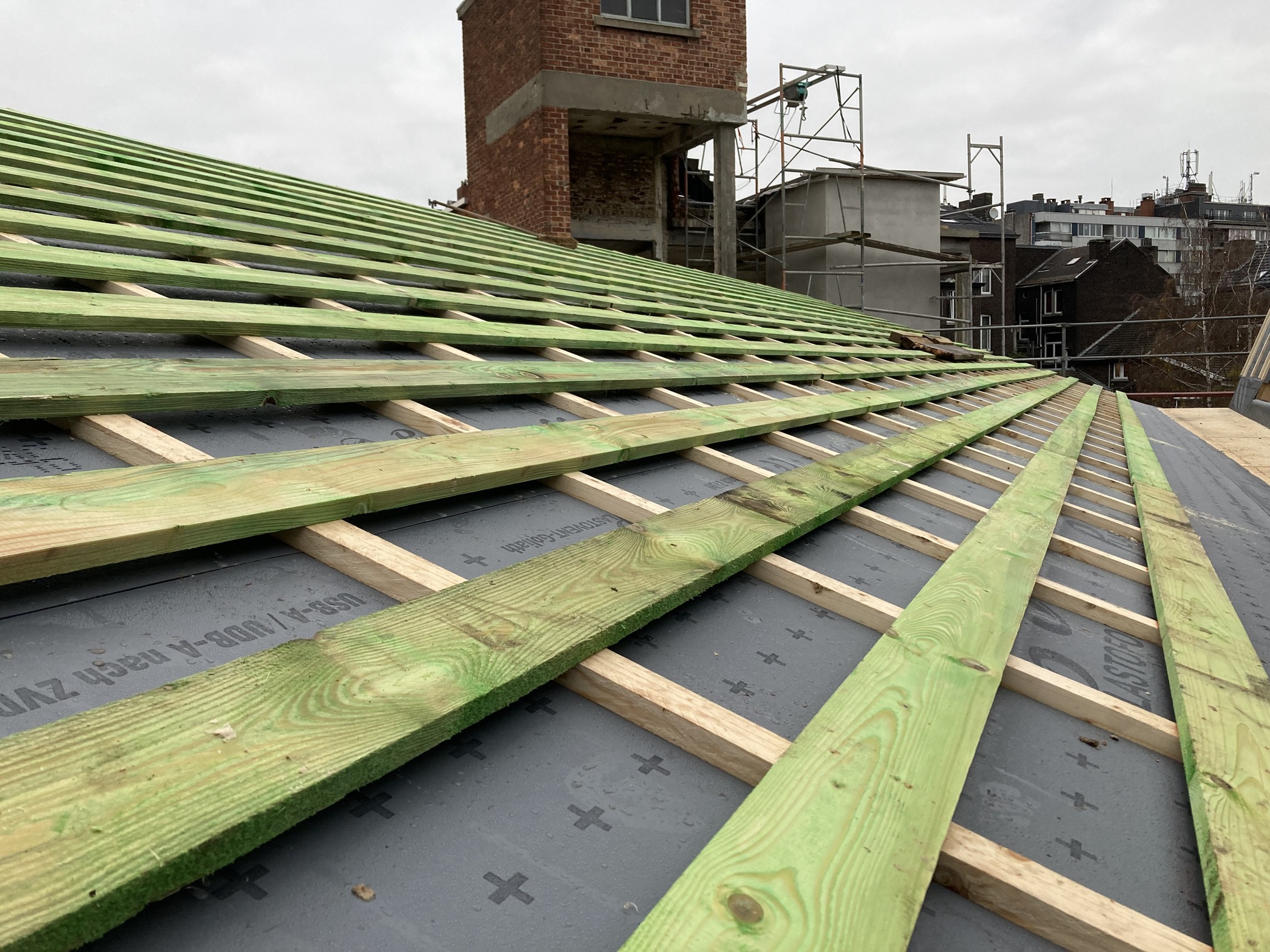 14 décembre : Pose des voligeages sur les toitures des sheds.