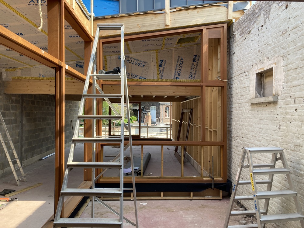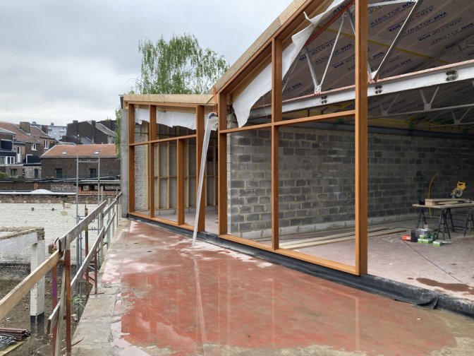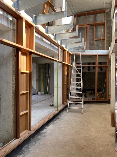 26 avril : Pose des châssis en afzélia le long de la coursive sur jardin.