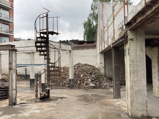 18 mai 2021 : Dans les futurs jardin, l’ancien escalier en fonte fait figure de sculpture.